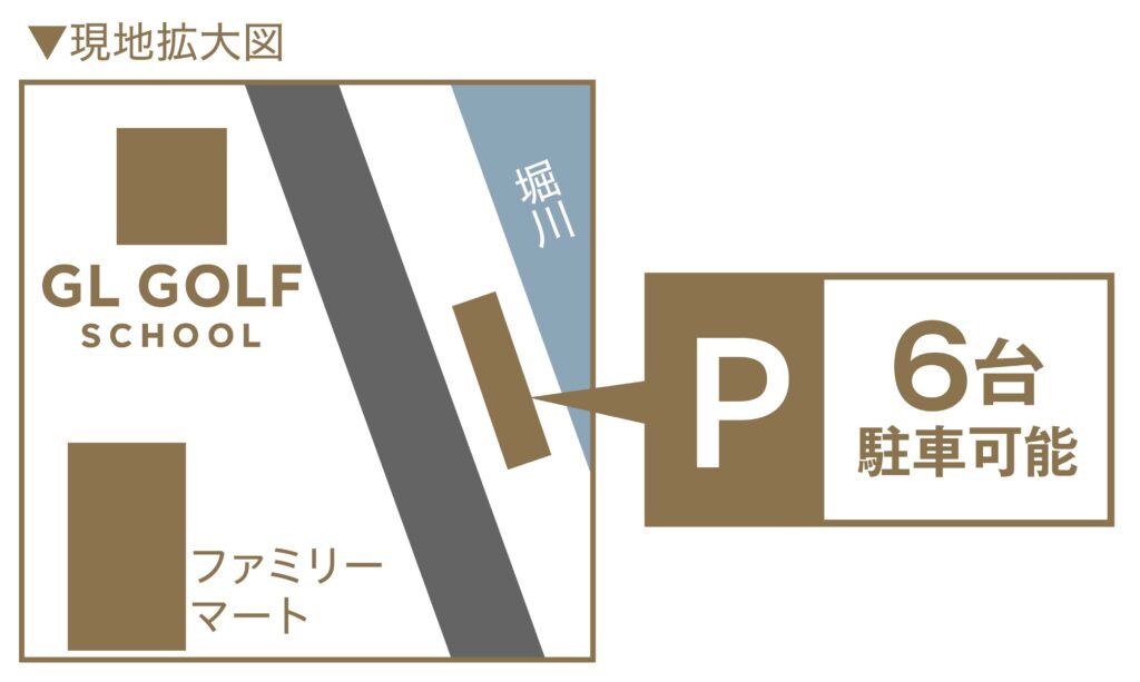 駐車場は店舗前の道路を挟んだ斜め向かいに6台分ございます。各駐車場のアスファルト面に「GL」と白線表示がありますので、そちらに駐車願います。